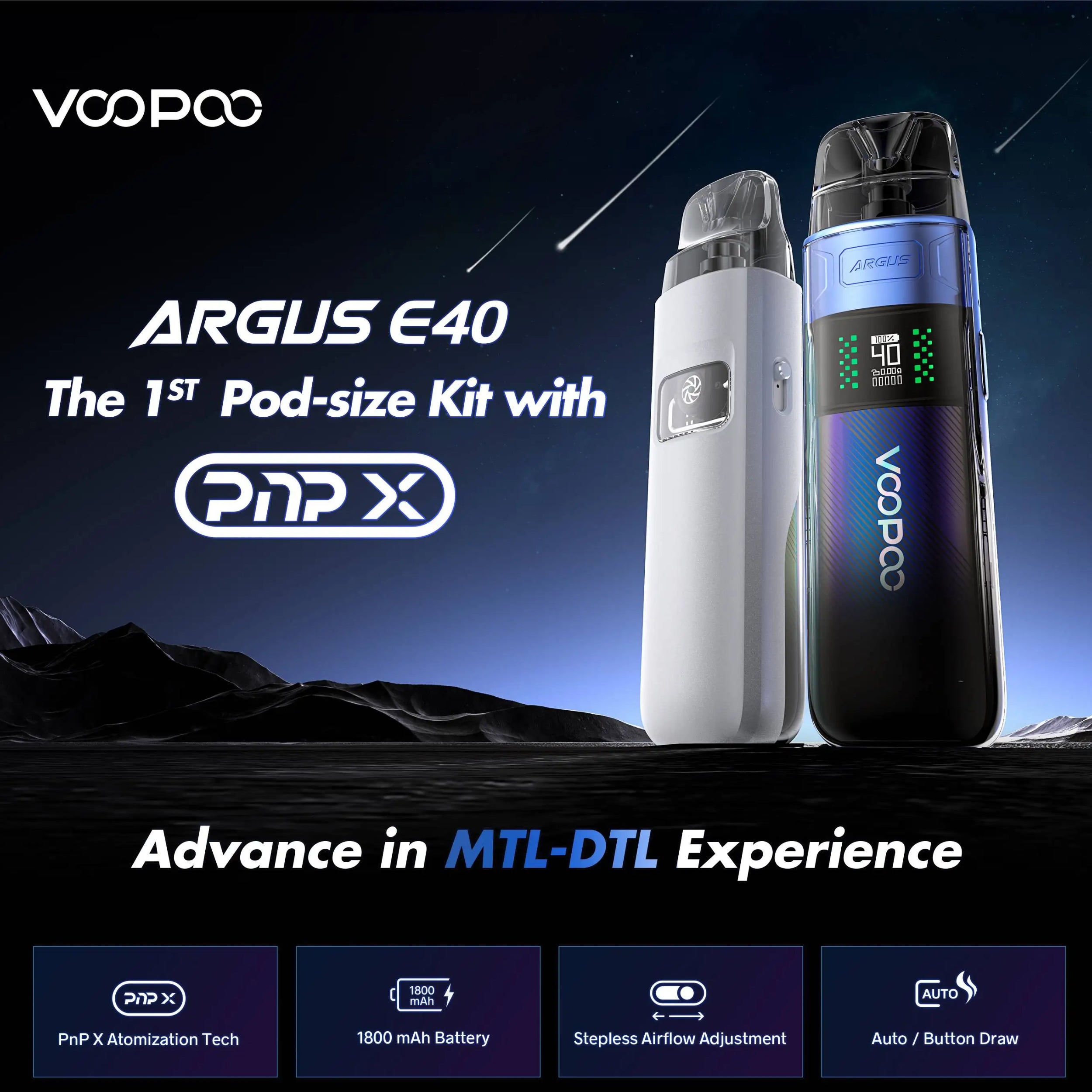 Argus E40 Kit is designed with 1800mAh battery, auto/button draw. Adopting PnP X Atomizer Tech, it is compatible with PnP X Coils, provides denser cloud & purer taste, 100 ml long coil life without leakage & coil burning. With the stepless airflow adjustment, you can adjust vaping from MTL to DTL smoothly. VOOPOO Argus E40 is also compatible with Argus PnP X Cartridge with PnP X 0.3Ω/0.45Ω/0.6Ω.